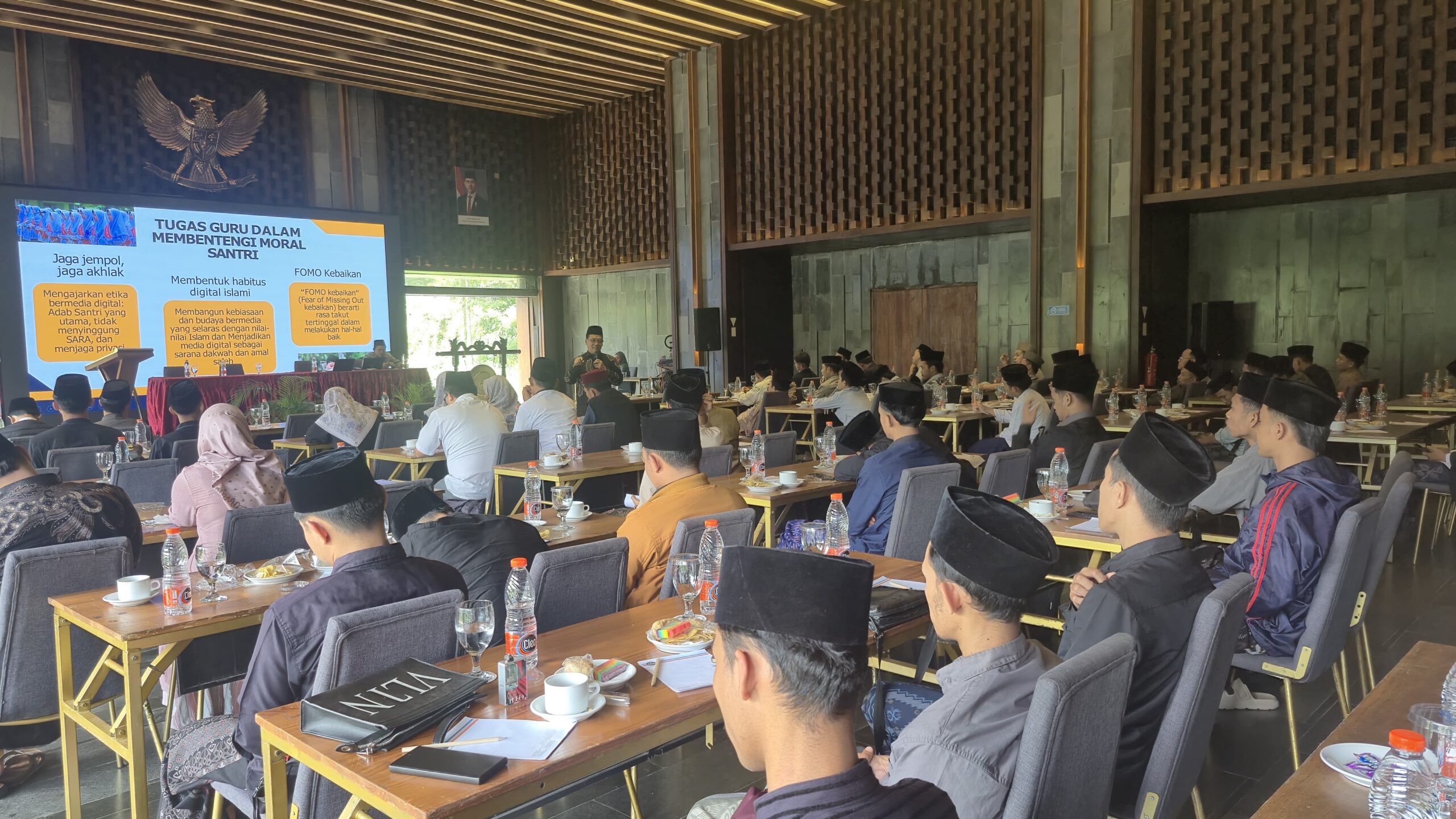 Seminar panel yang dipimpin oleh moderator, menghadirkan dua narasumber utama. Narasumber pertama, Prof. Dr. H. Sunhaji, M.Ag., Wakil Rektor 3 UIN Saizu Purwokerto, membawakan tema “Menguatkan Etika Digital Berbasis Nilai Islami di Era Disrupsi 4.0 dan 5.0”. Prof. Sunhaji menyampaikan bahwa santri di era ini dituntut untuk menguasai dua hal: mendalami ilmu agama (tafaqquh fiddin) dan melek literasi digital. Ia memperkenalkan prinsip B.I.J.A.K sebagai panduan komunikasi digital: Beradab dalam tutur, Inspiratif, Jaga etika dan empati, Aman berbagi data, dan Kritis menyaring konten. Selain itu, ia mengajak untuk membangun budaya “FOMO Kebaikan” (rasa takut ketinggalan berbuat baik), agar media digital dijadikan sarana dakwah dan amal saleh.